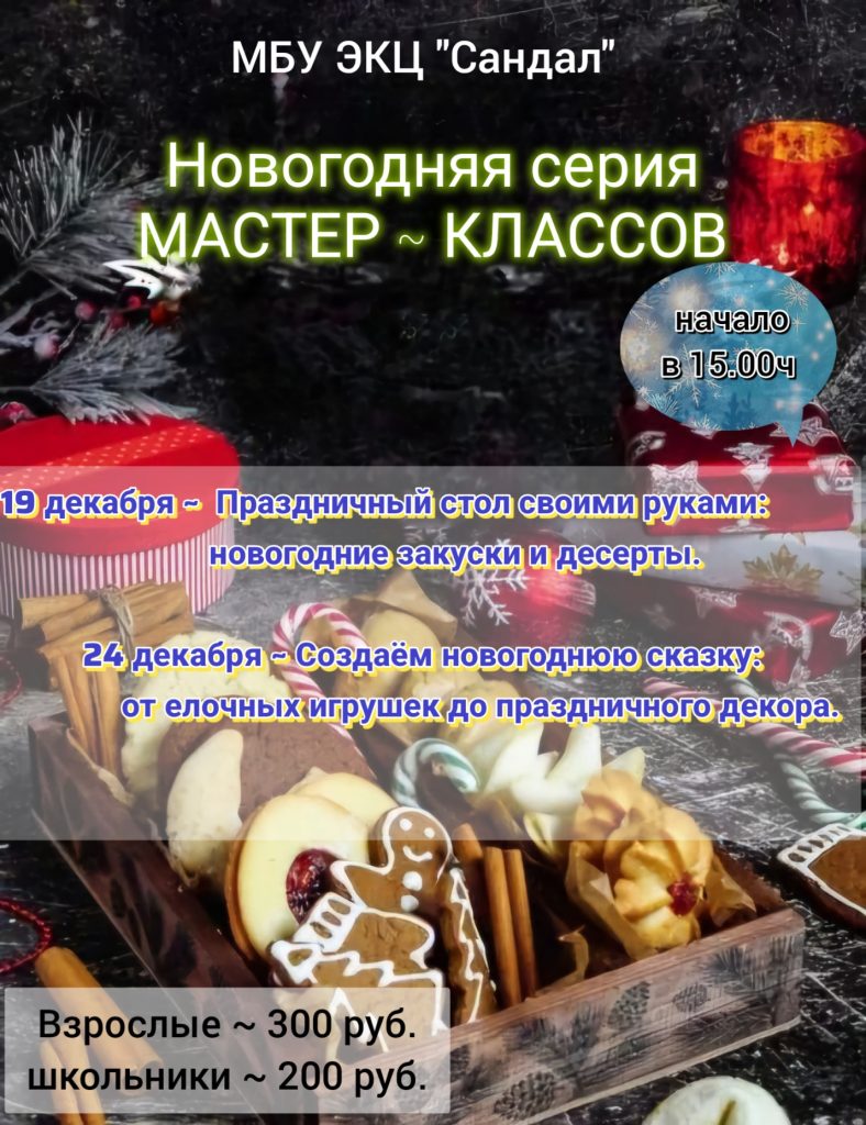 В преддверии самого главного праздника – Нового года 19 и 24 декабря в 15.00ч. в МБУ ЭКЦ «Сандал» пройдут мастер-классы.